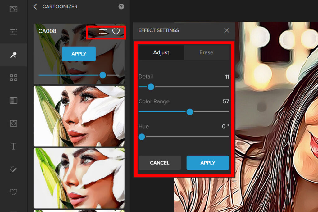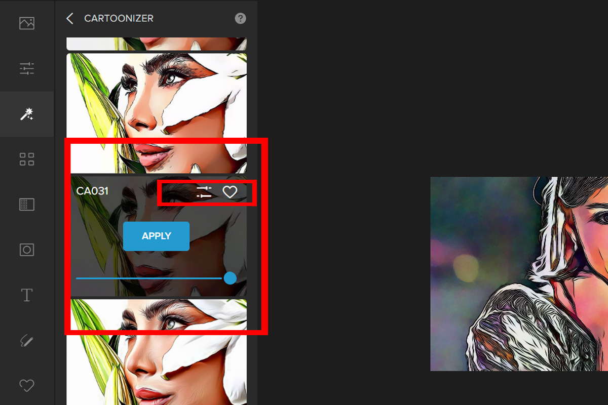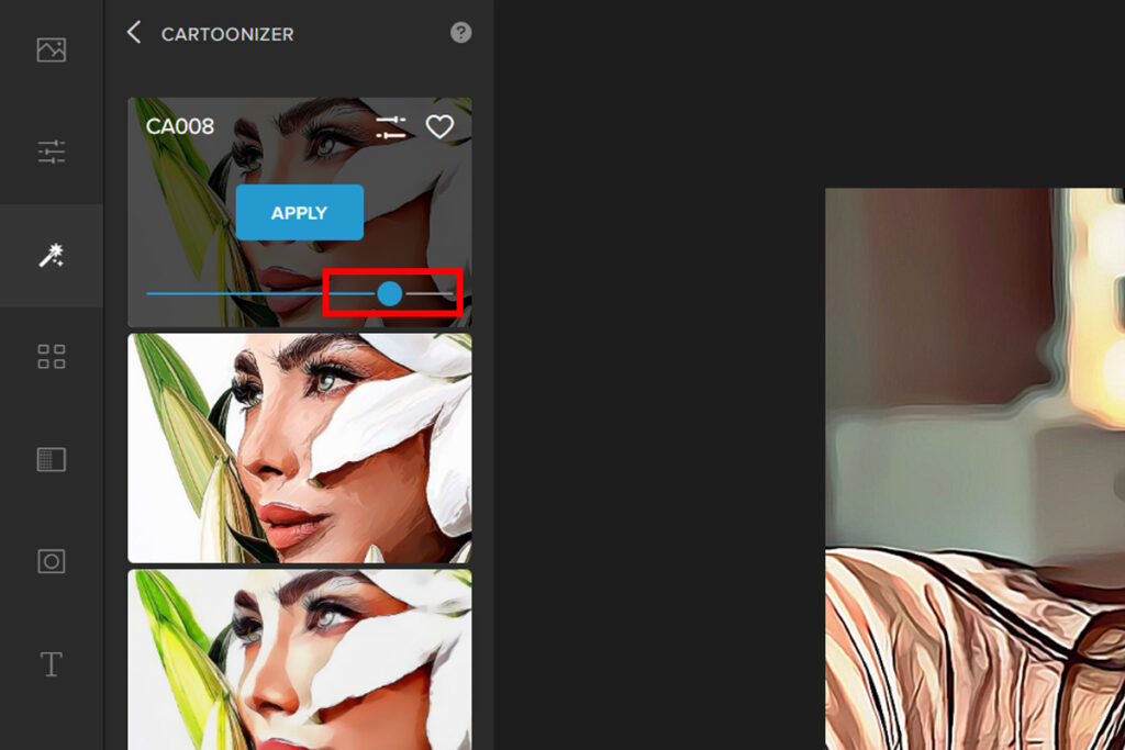 Step 3: Pick a Cartoonizer filter. For this example we will be using CA008. Adjust the Slider to change the filter’s intensity.