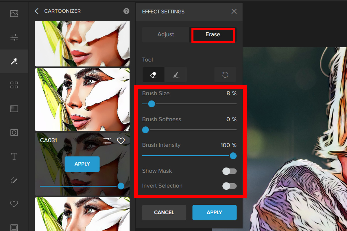 Step 2: Go to the Erase tab. Change the size of the eraser’s brush and paint over the parts you don’t want to be cartoonized.