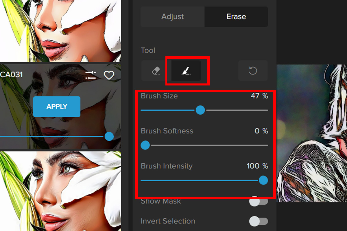 Step 3: If you made a mistake and need to bring back the effect to a certain area, click on the Brush icon, adjust the brush size and paint over to the area where you want the filter to take effect.