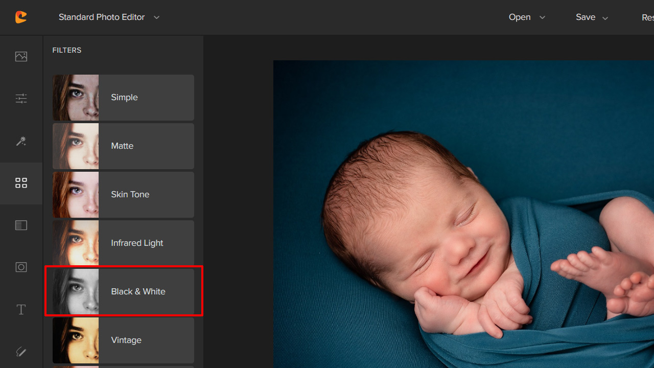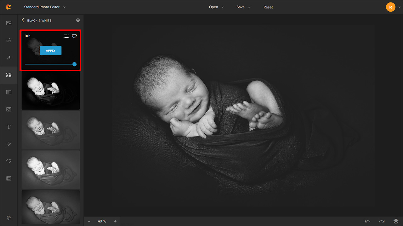 Step 5: Choose the Black and White filter you like and hit Apply.