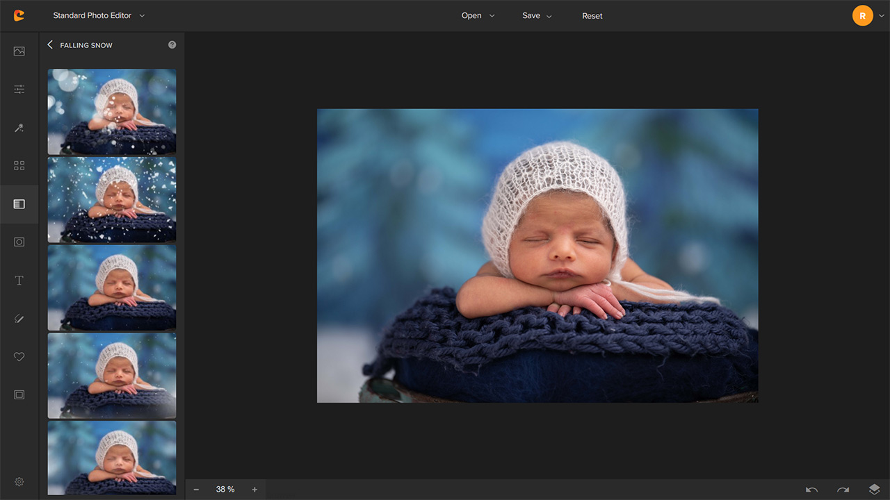 If you cannot go outdoors, you can always set up a scene and add the missing bits using a fun-to-use photo editor like Colorcinch. Here I added the falling snowflakes effect to this picture. Here’s how to do it: