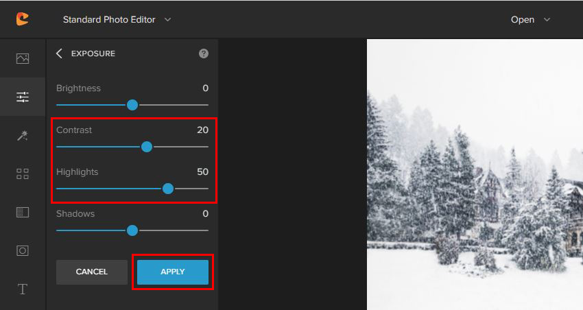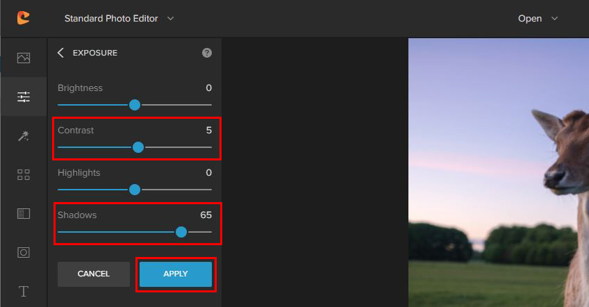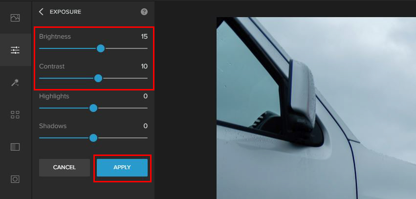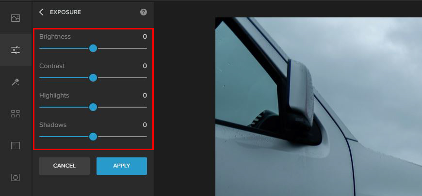 Once that has been selected you will see a list of slider options to choose from, such as: Brightness, Highlights, and Shadows. Additionally, there is a Contrast slider, which I will explain below.