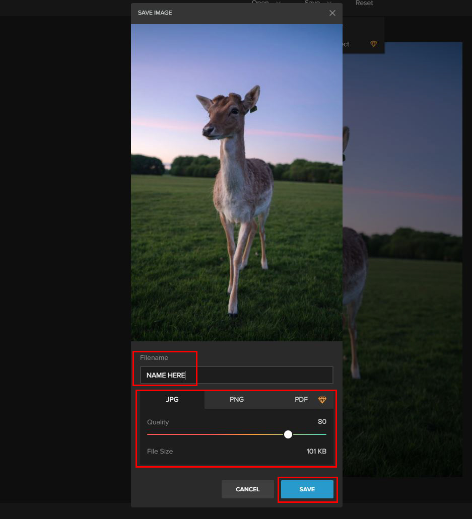 Next, name your image, select the file type, (JPG, PNG, PDF), as well as the quality and file size.