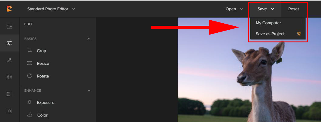 Once you’re happy with your adjustments and have clicked on Apply, you can click on the Save drop-down menu and select the location in which you want to save your image.