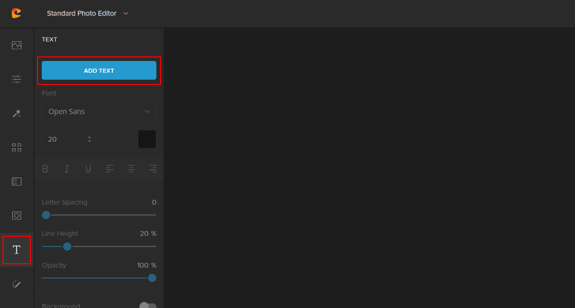 To add text to a project, navigate to Text left menu and click ADD TEXT button.