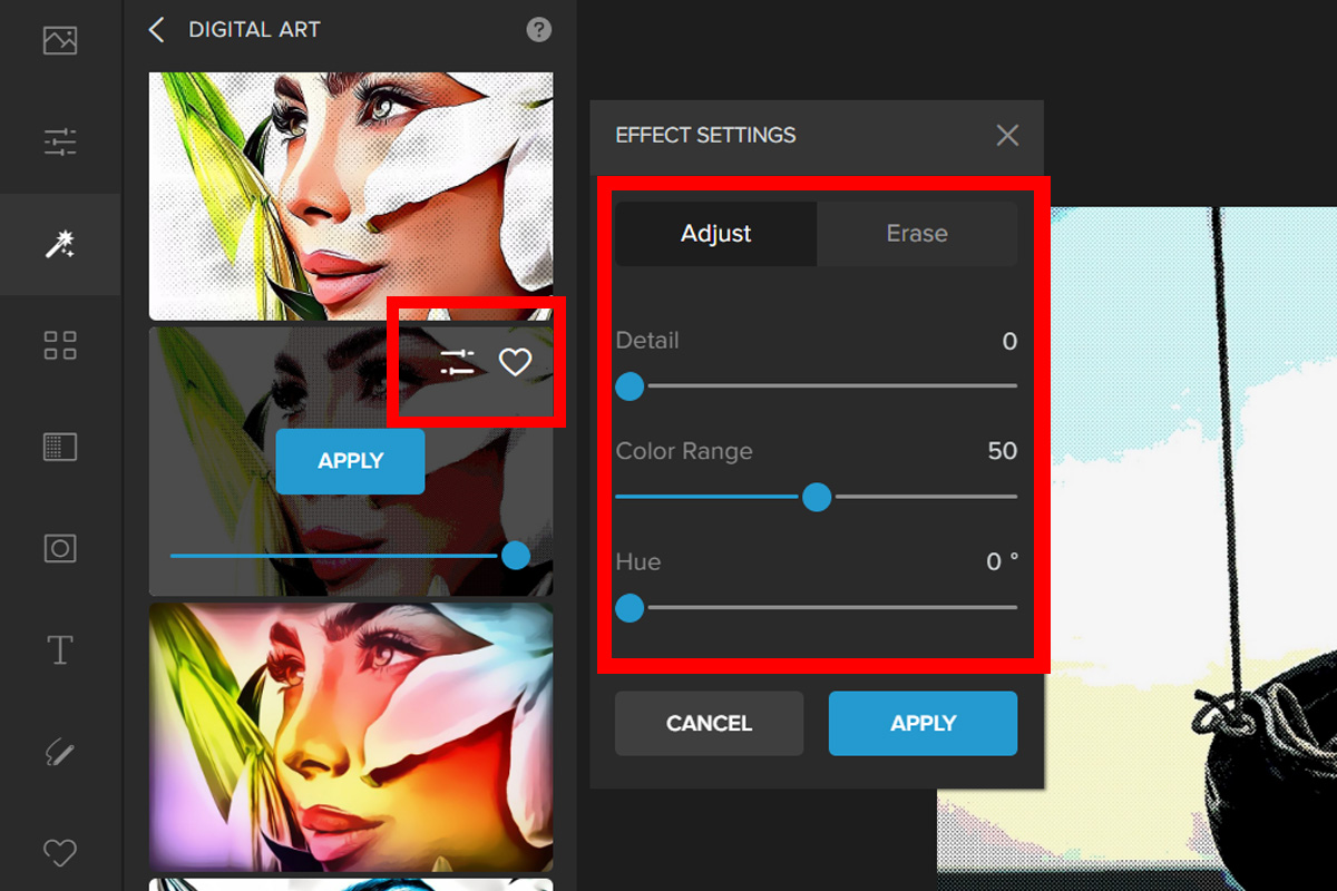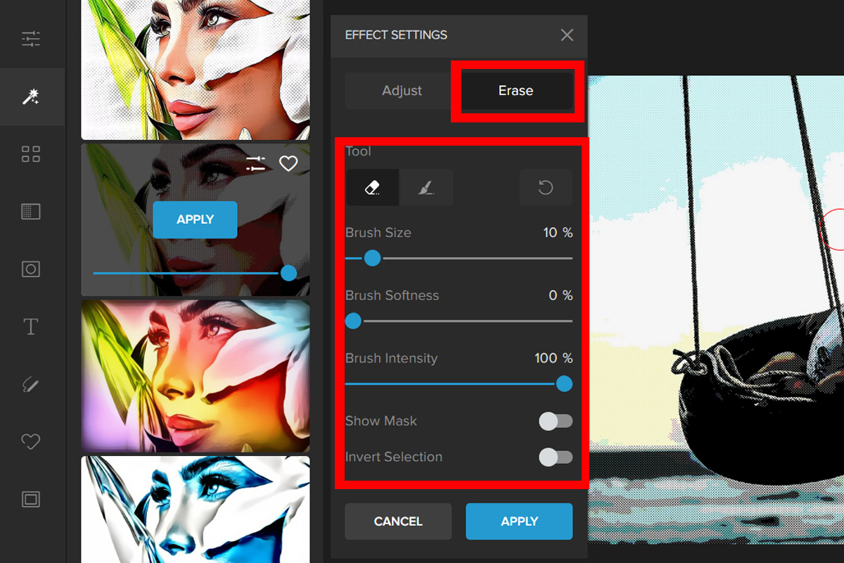 Step 5: You also have the ability to remove the effect from specific areas of the photo. Click on the Erase tab to perform this. Change the Brush’s settings, and then paint over the parts where you wish to preserve the original look.