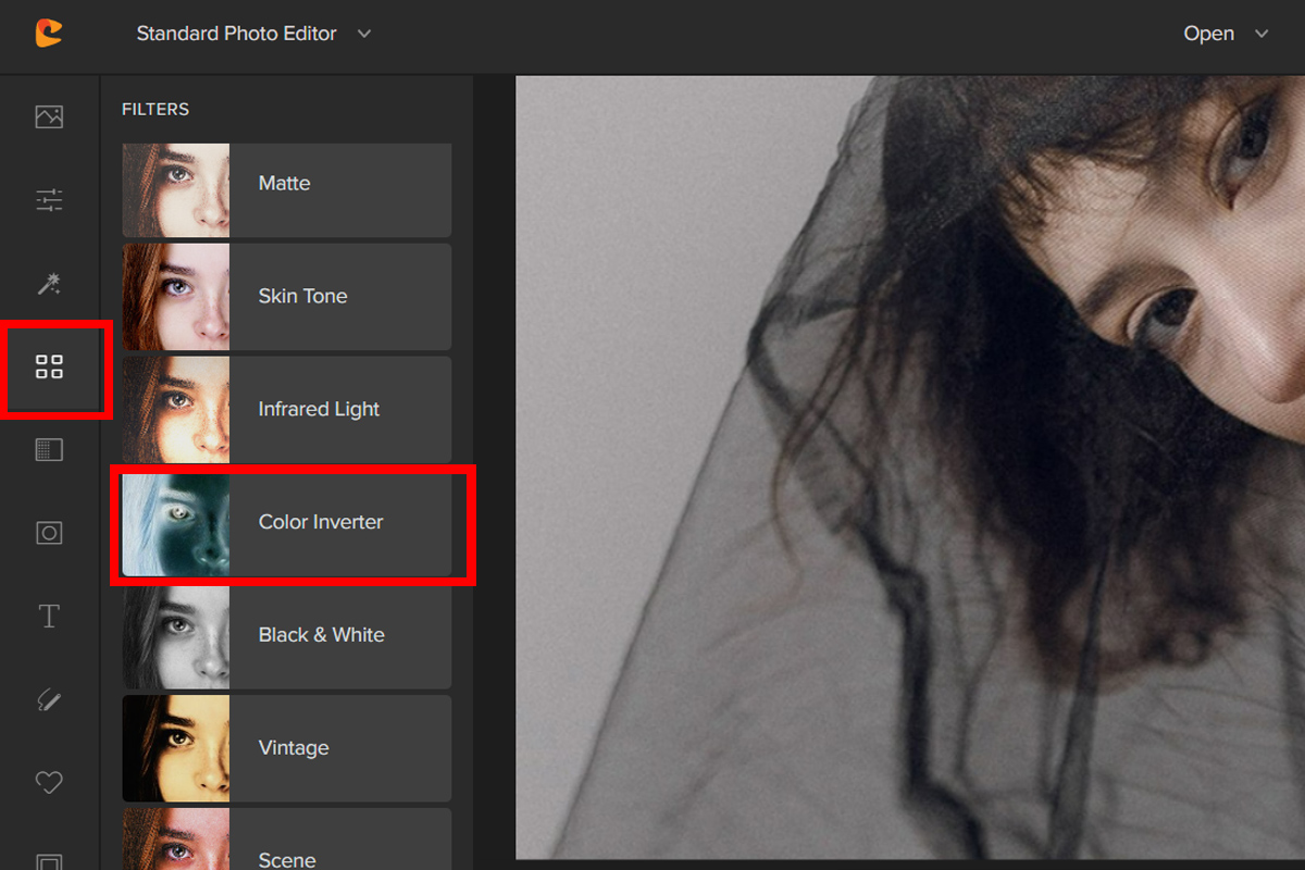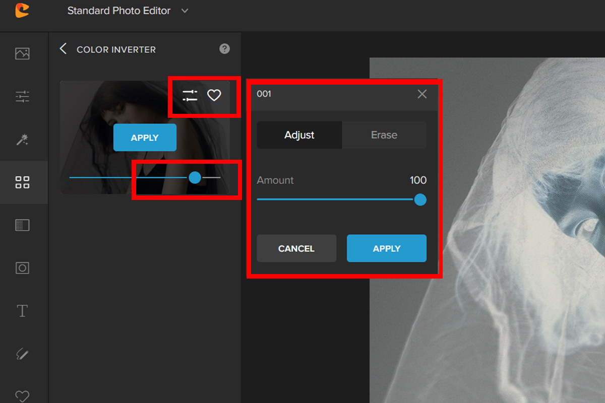 Step 3: Pick a Color Inverter filter. Adjust the filter by the Slider or by clicking on the Settings button.
