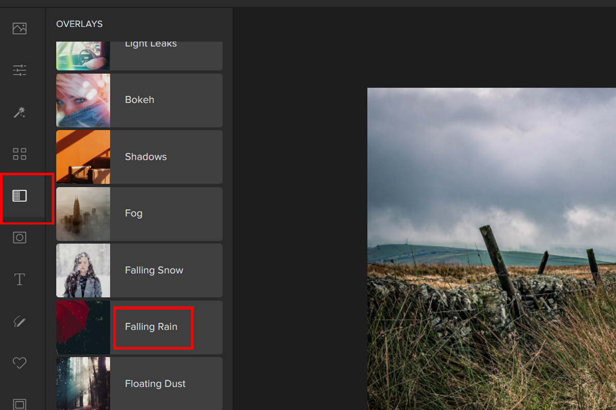 Step 2: Navigate to Overlays on the left side of the panel and click on Falling Rain.