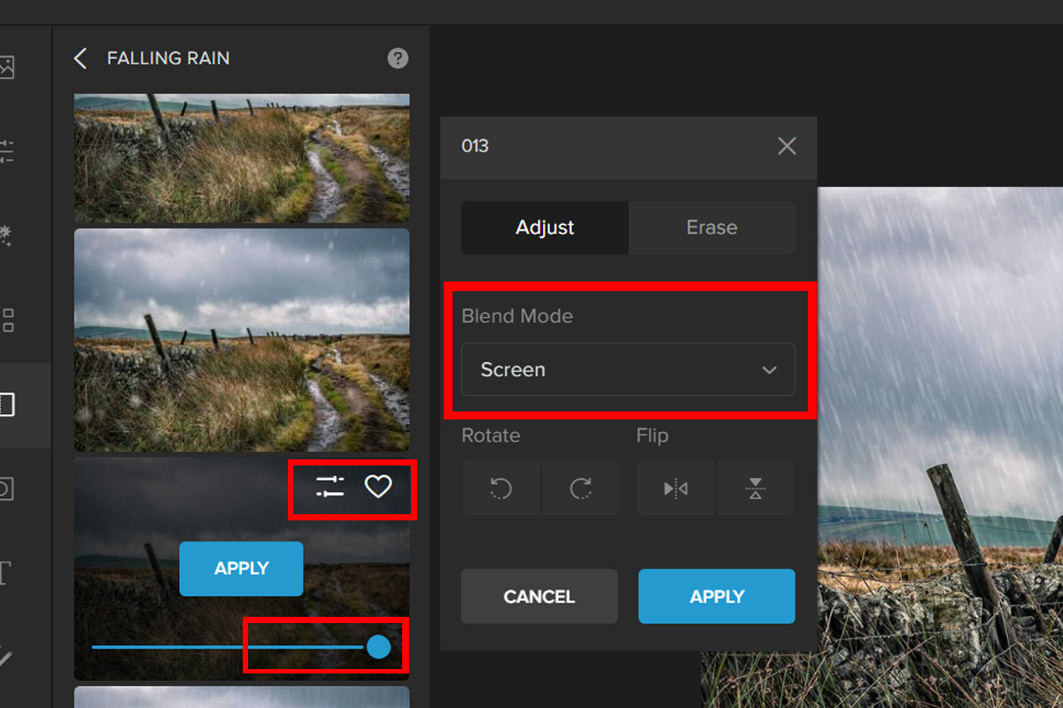Step 3: Pick a Falling Rain effect. Adjust the filter by the Slider or by clicking on the settings button and experiment with the different Blend Modes.