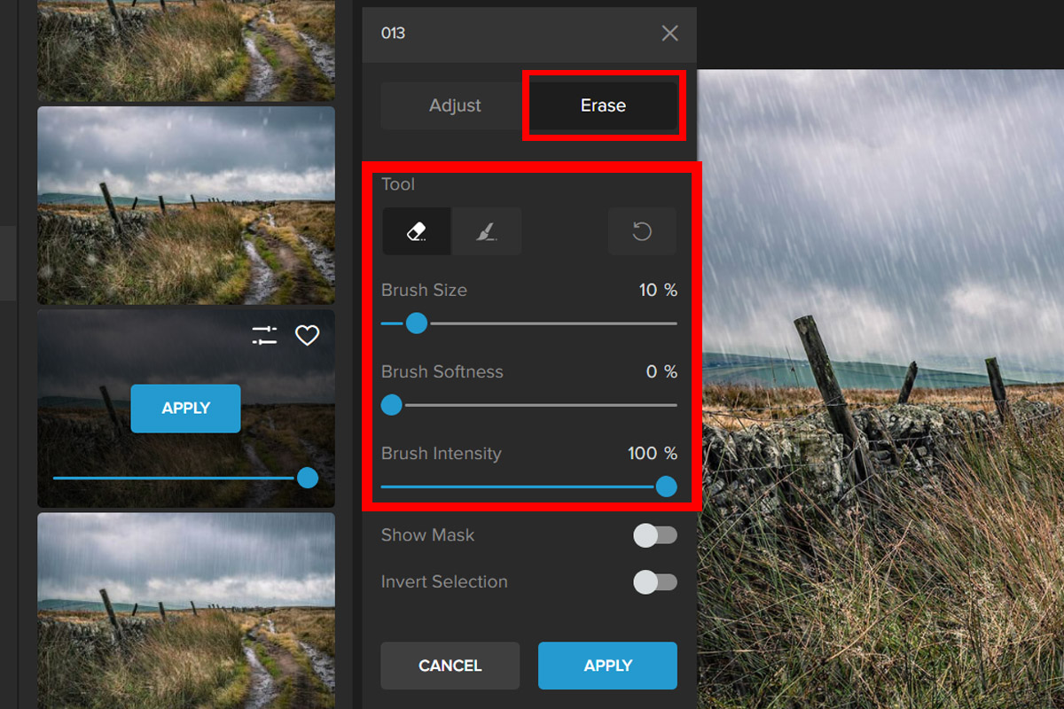 Step 4: You can also remove the overlay effect from areas where you don’t want it. To do this, click the tab labeled Erase. Change the Brush settings and then paint over an area to remove the effect.