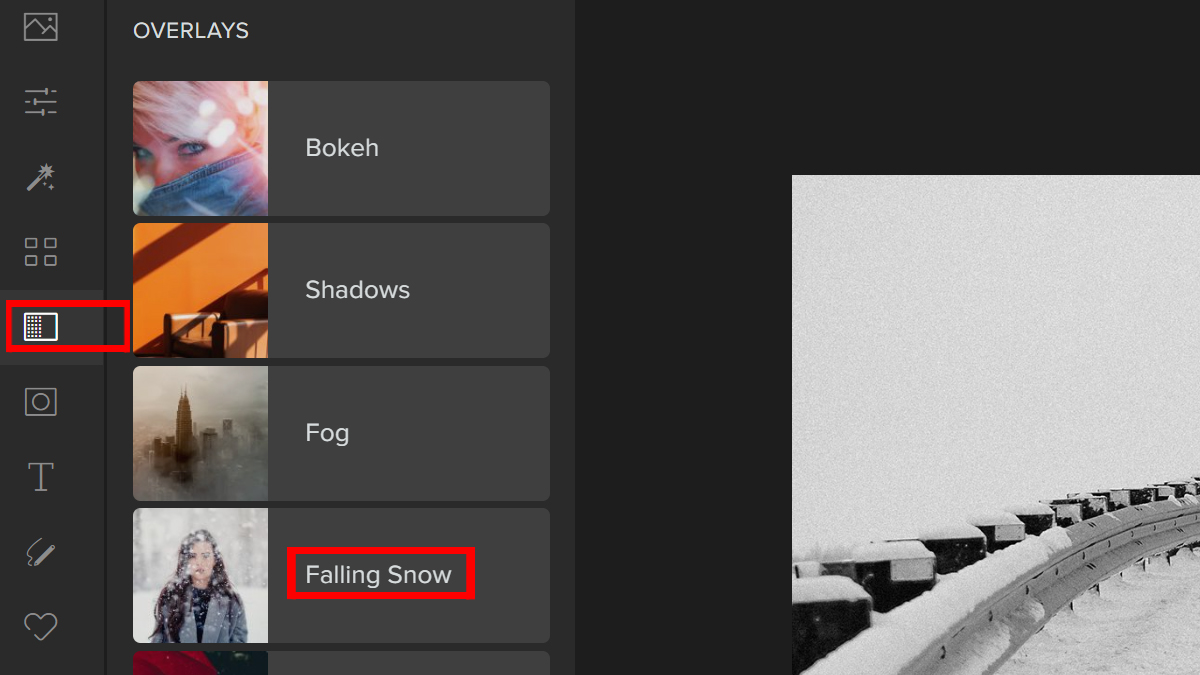Step 2: Navigate to Overlay on the left side of the panel and it will open a tab of Overlay filters. Scan through it and choose Falling Snow. Pick a Falling Snow filter that would fit your image.