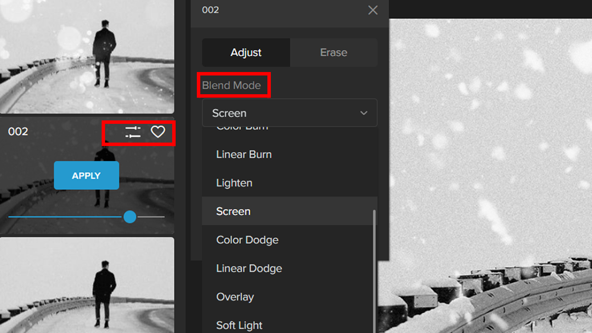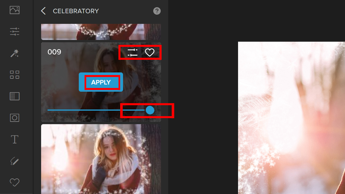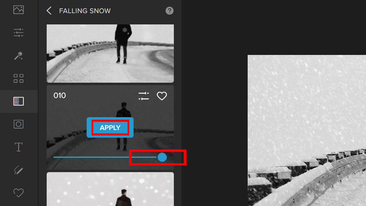 Step 3: Fine-tune the effect by adjusting the Slider. You may have a moderate snowfall or a heavy one, depending on how you like your photos to look. Once adjustments are made, click Apply.