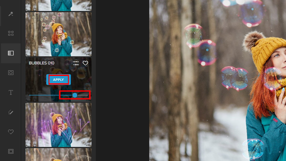 Step 2: Choose from the wide array of Specialty Overlays. For this photo, we will be adding a bubble effect. Make your adjustments using the Slider and click Apply once done.