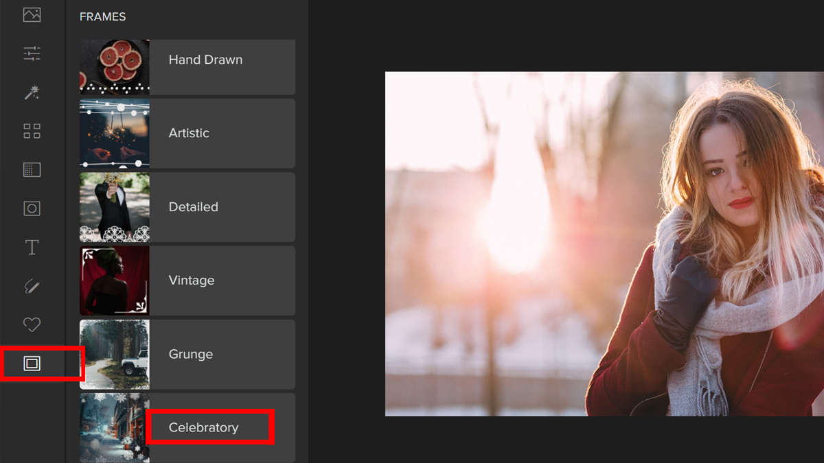 Step 1: Start by opening Colorcinch and Upload an image. Navigate to Frames. Colorcinch has a wide array of frames to choose from. Scroll down and pick Celebratory.