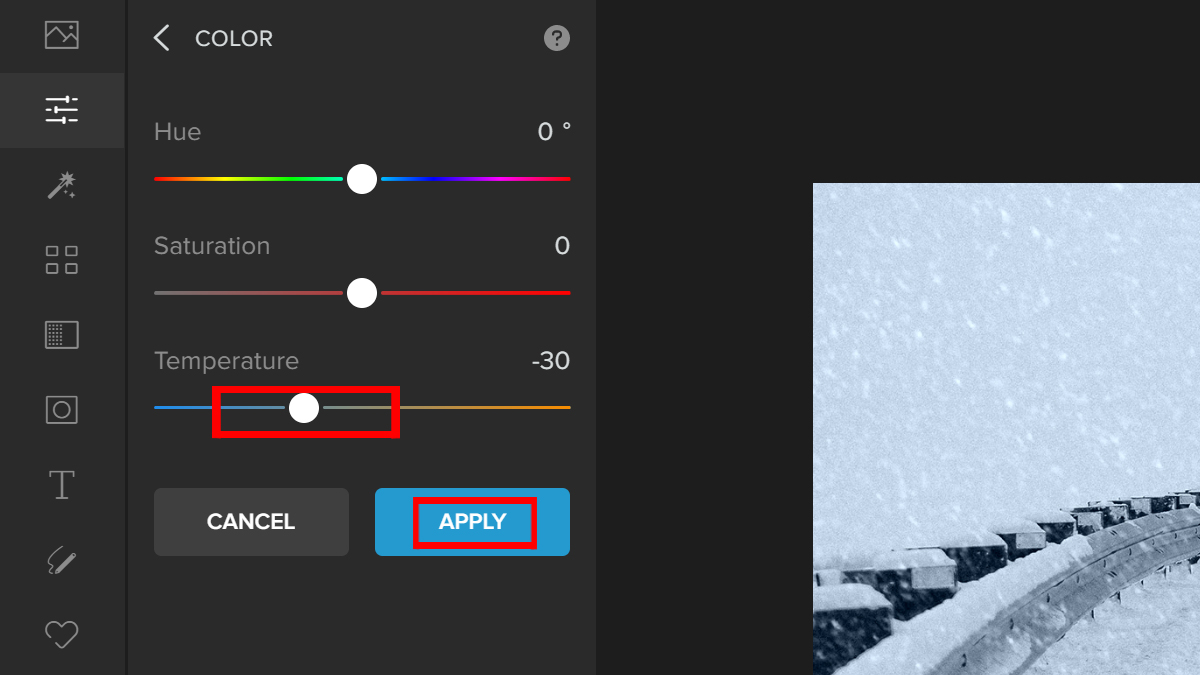 Step 2: Adjust the Temperature Slider to give the image a cooler tone. Once satisfied with the adjustments, click on Apply.