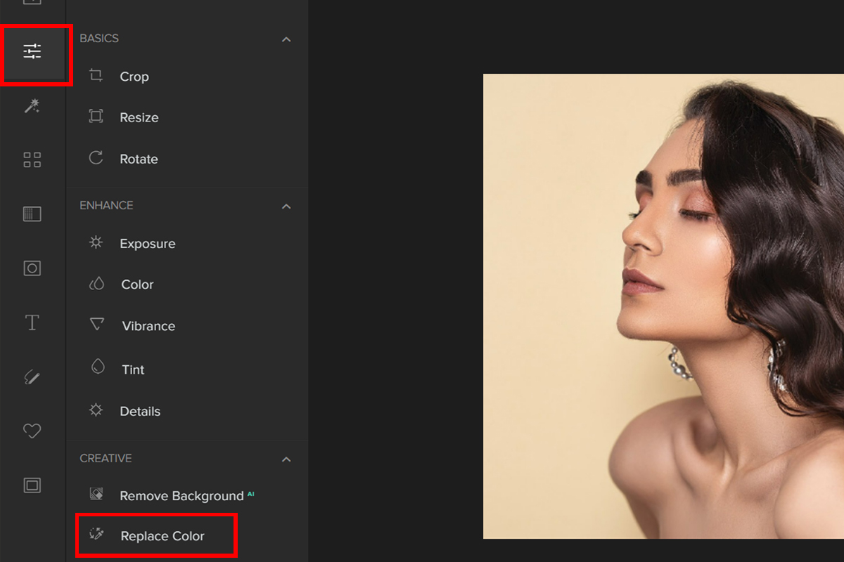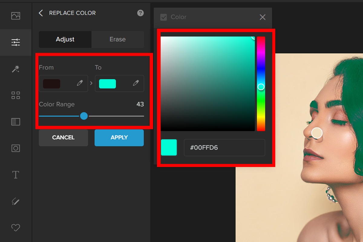 Step 3: To get the hair color you want, click on the tool that looks like an eye dropper and then click anywhere on the hair to sample a color and make it the From color. Change the To color by picking a color on the Color tab.