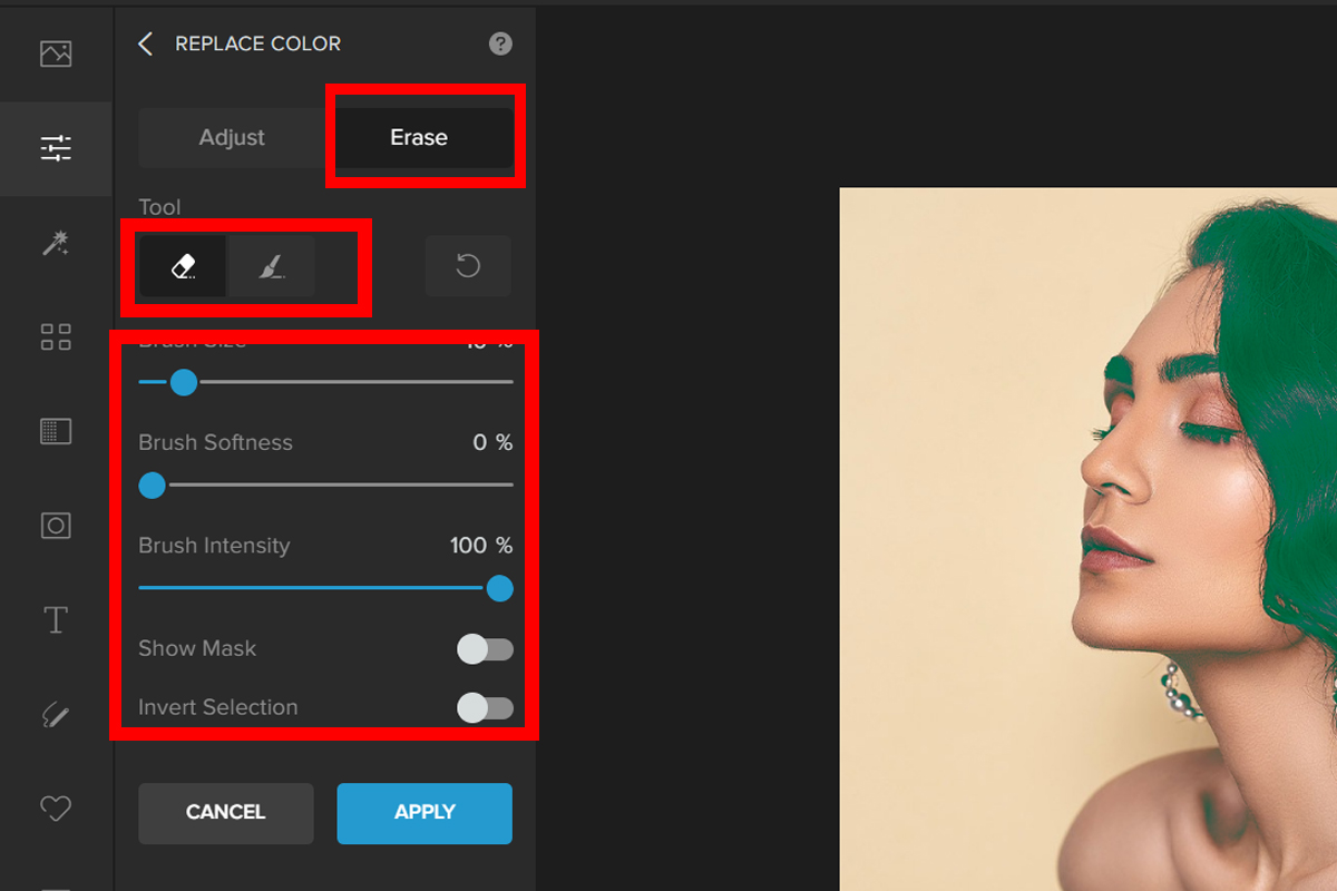 Step 4: Select the Erase tab and change the settings for the Brush, and then paint over the areas to redo or restore the original color.