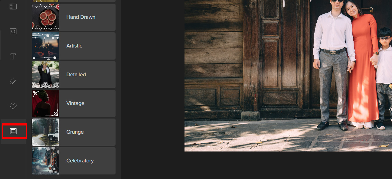 Step 2: Navigate to Frames on the left side of the panel and it will open a tab full of Frames options. You have an option to customize a frame or choose from the variety of frames available.