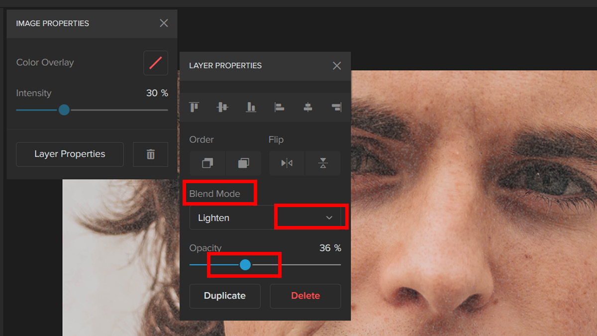 An alternate way is to use Blend Mode. Choose a Blend Mode by clicking on the dropdown menu and adjusting the Opacity using the Slider.