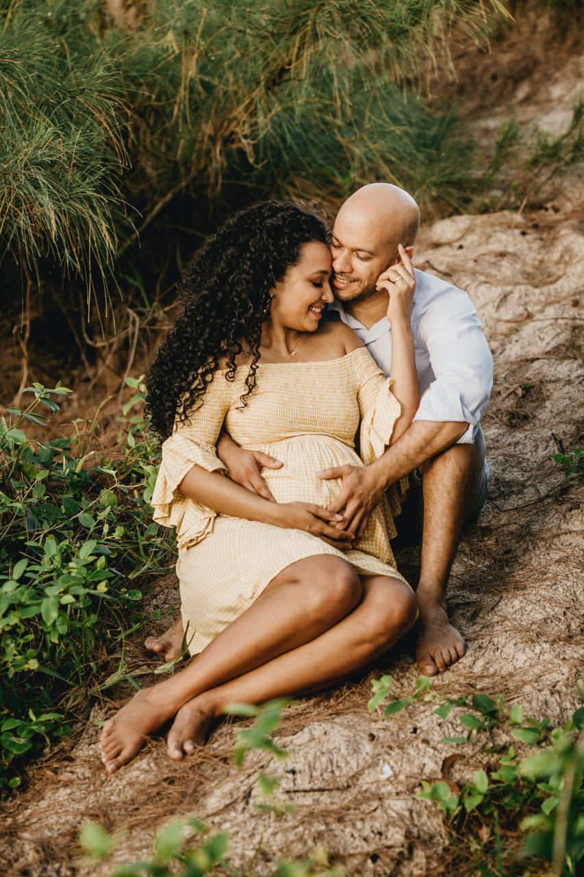 Another meaningful couple maternity photoshoot idea is to lean on each other back-to-back. While this can look casual, it also represents the couple’s support for each other.