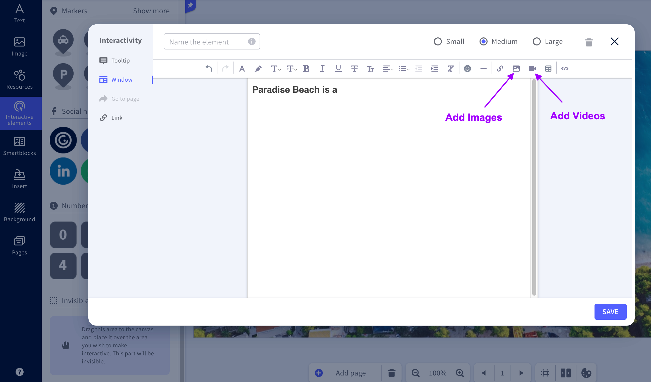 Content inserted as a tooltip will appear in a chat bubble when the viewer hovers their cursor over the corresponding hotspot. On the other hand, content inserted in a Window will appear when a viewer clicks on the hotspot.