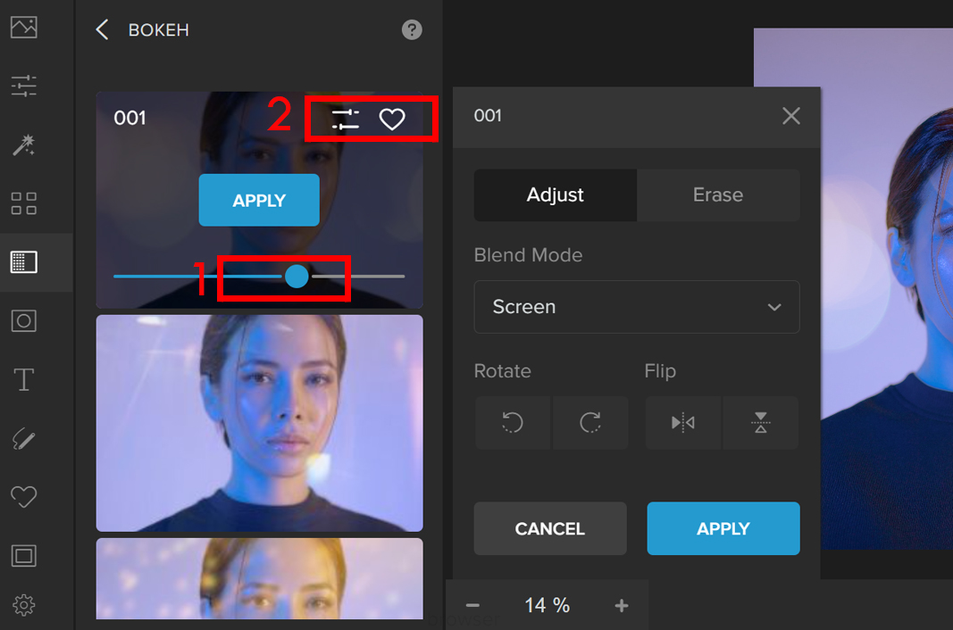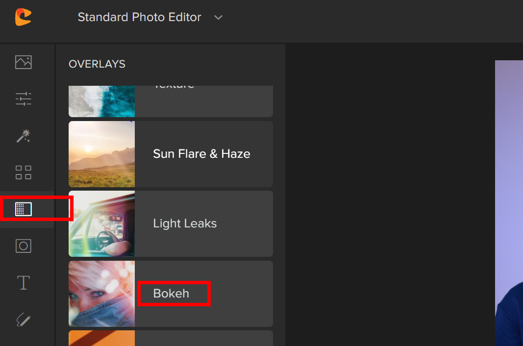 Step 2: Click Overlay on the left side of the panel and it will open a tab of overlay filters. Navigate through it and feel free to use any filter you like. For this tutorial, I will use Bokeh.