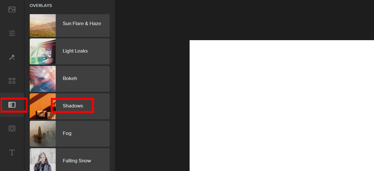 Step 2: Click on Overlay on the left side of the panel. Then navigate through it and choose Shadows.