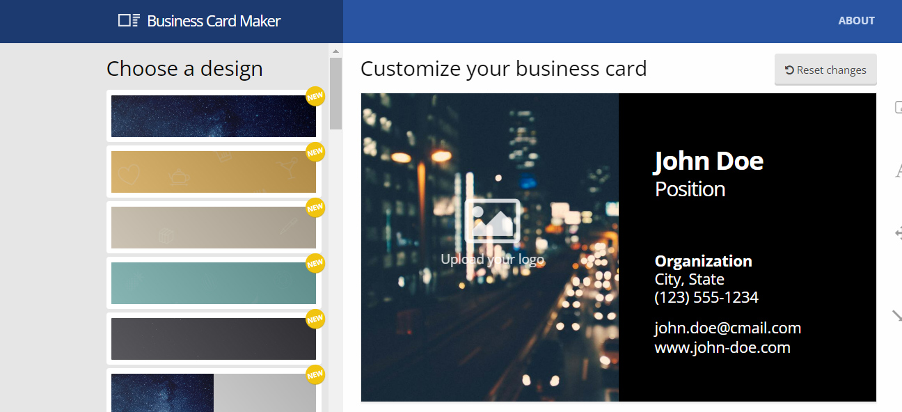 Business Card Maker has a bunch of free, colorful layouts for business cards. Each of them can be changed with just a few clicks. Before you save your file, you can add your logo and move the text boxes around. Add personal touch to your business card.