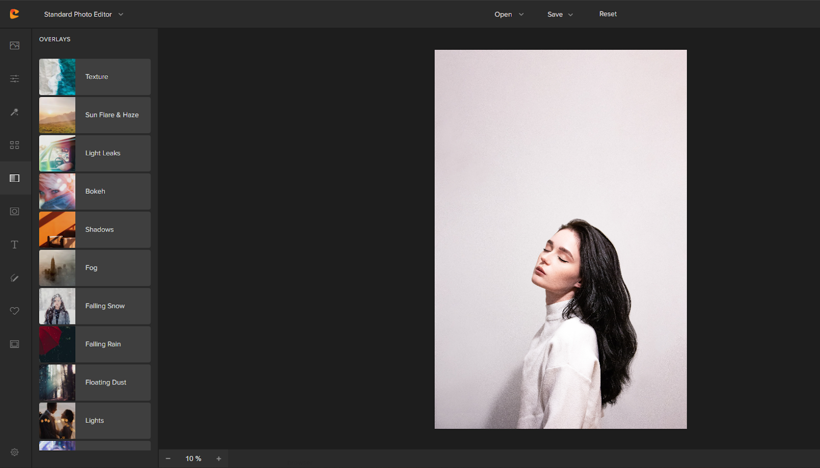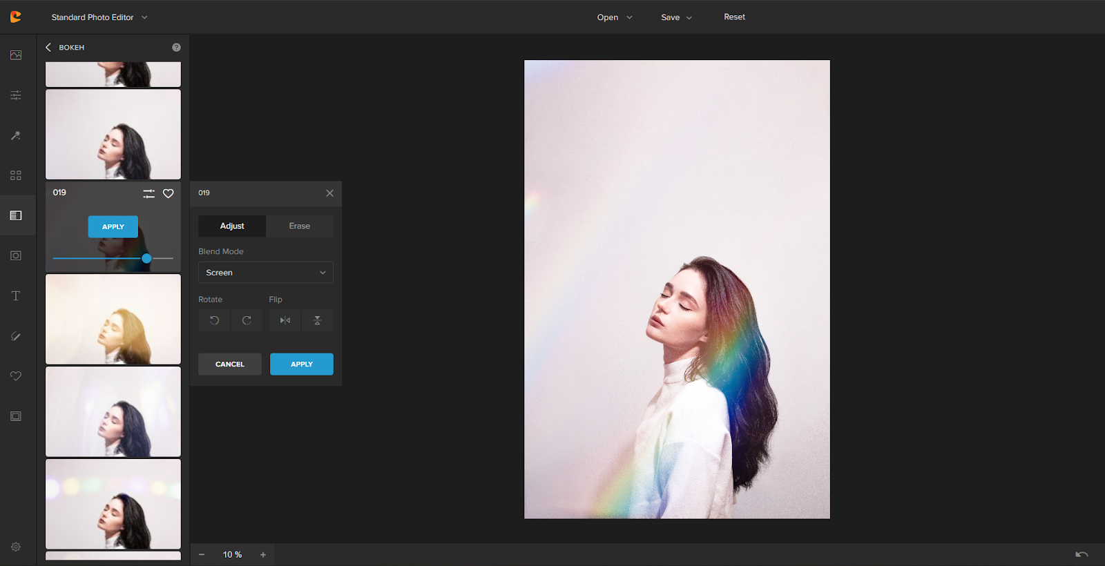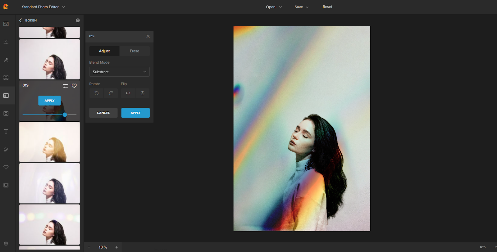 Adding overlays in Colorcinch is just a matter of uploading your photo, clicking on the “Overlays” tab, and choosing from the many options available. You can even rotate and flip the effects around so that they fit your photo just right.