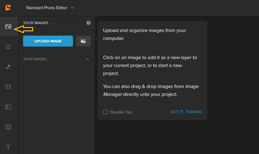 Alternatively, you can click on the “Image Manager” icon to upload your images to Colorcinch.