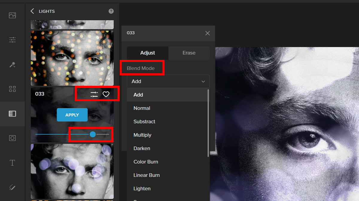 Step 3: Choose a Lights filter and click on Settings. Try the different Blend Modes and adjust the Slider until you get your desired opacity.