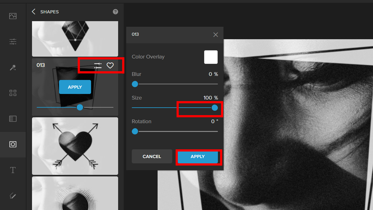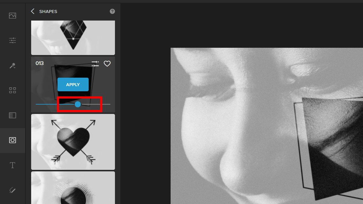 Step 3: Choose a Shapes filter that would fit your image. You can also refine the opacity by adjusting the Slider.