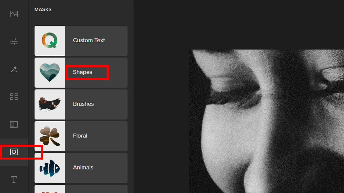 Step 2: Navigate to Masks on the left side of the panel and it will open a tab of Mask filters. Navigate through it and choose any filter. For this tutorial, we will Shapes.