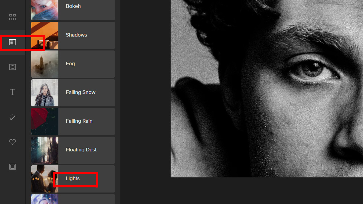 Step 2: Click Overlay on the left side of the panel and it will open a tab of overlay filters. Navigate through it and pick Lights.