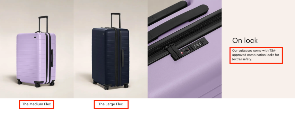 The context clue in this example is the name of the suitcase “medium flex” and “large flex”. It helps visitors understand that the suitcase is a different size and not just a different color. They also describe the lock that’s not visible in the original photos. These context clues help enhance the value of the photos and allow users to make informed purchasing decisions and increase conversion rates.