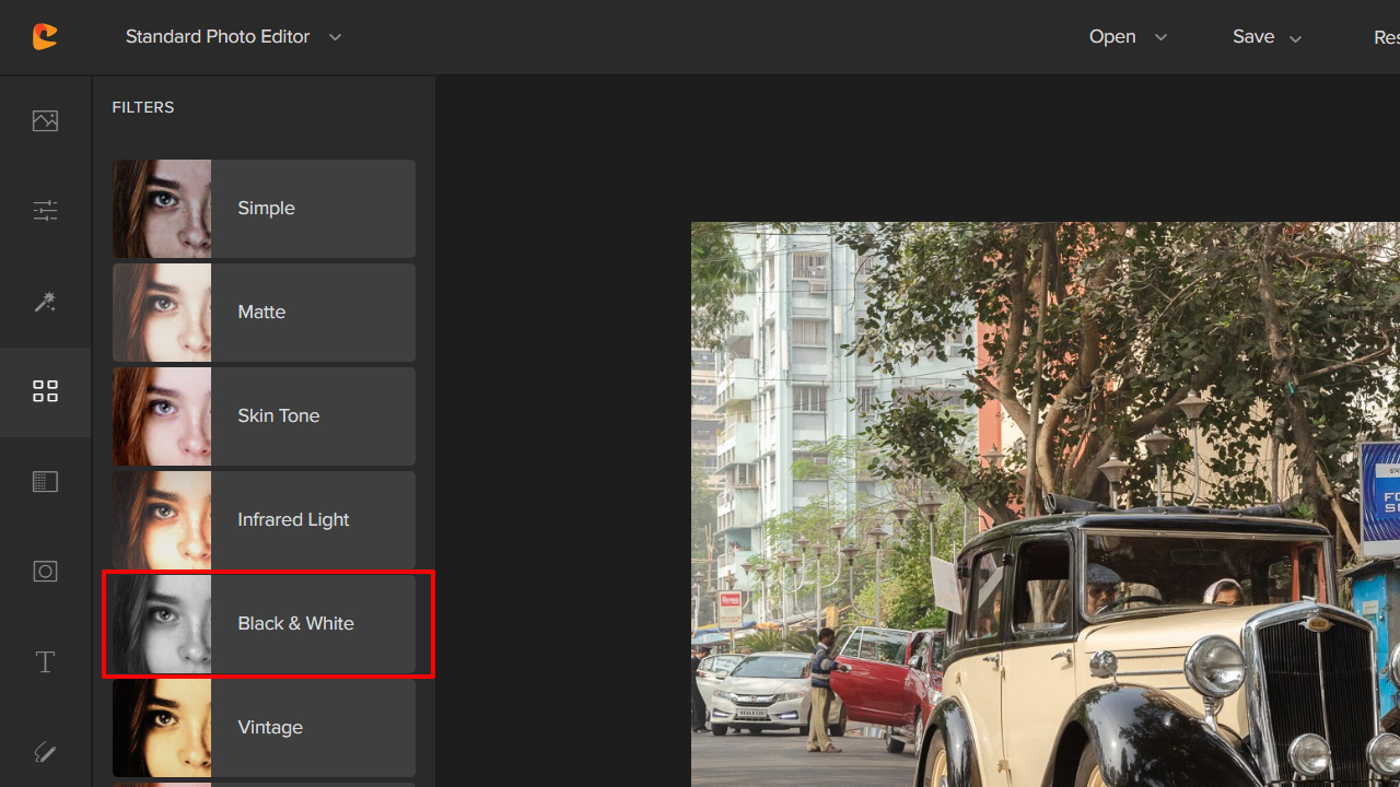 I love the black and white effects that many photographers use. The Black and White monochrome effect is easy to achieve using a photo editor like Colorcinch.
