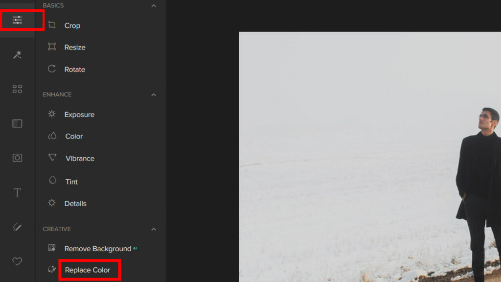 For simple editing tasks like what a paint bucket tool is used for, there is a tool that is easier to use and does the job better. We will be using a tool in Colorcinch called Replace Color.