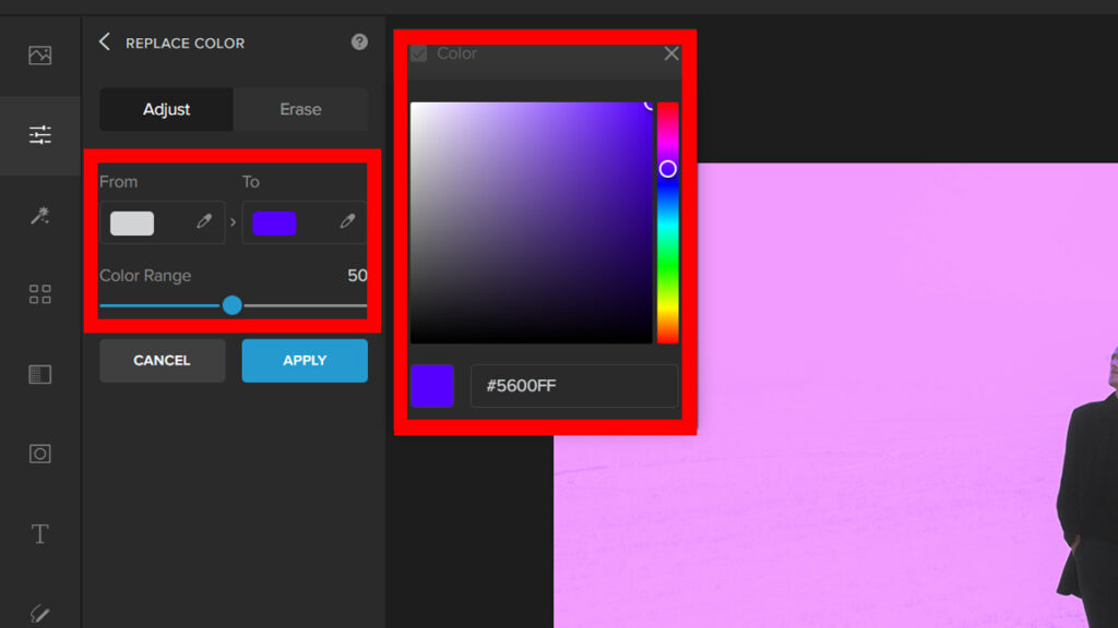 Step 3: Start by making adjustments to the From Color Picker and the To Color Picker on the Replace Color panel until you get the color you want. What it will do is change the color of the whole picture automatically.