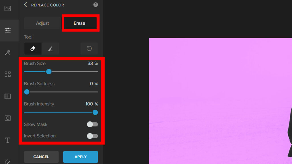 Step 4: Since the subject is the same color as the background, we will have to separate them. Click on the “Erase” tab to do this. Change the settings for the Brush, and then paint over your subject to remove the color.
